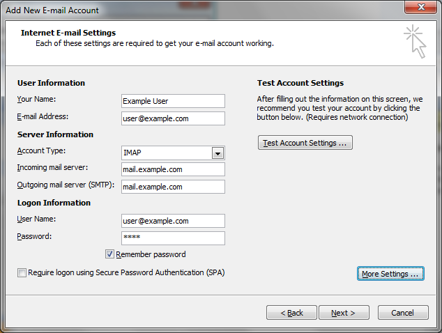Az Account type -nál válassza az POP beállítást, az Incoming mail server (IMAP) és az Outgoing mail server (SMTP) mezőkbe a levélszerver címét, mail.example.com